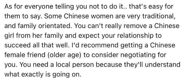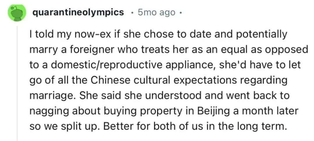 一位网友写道,自己告诉了前女友,如果她选择约会并有可能嫁给一个平等对她而不是当成家庭/生育工具的外国人,她就必须放下中国文化中对婚姻的所有期望。她说她理解,但一个月后就又开始唠叨在北京买房的事,于是我们分手了。从长远来看,这样对我们都好。