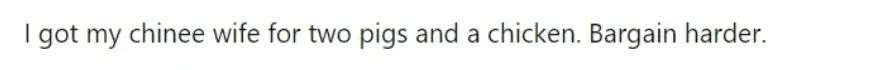表示自己用两头猪和一只鸡娶到了自己的中国老婆,建议小伙讲讲价。