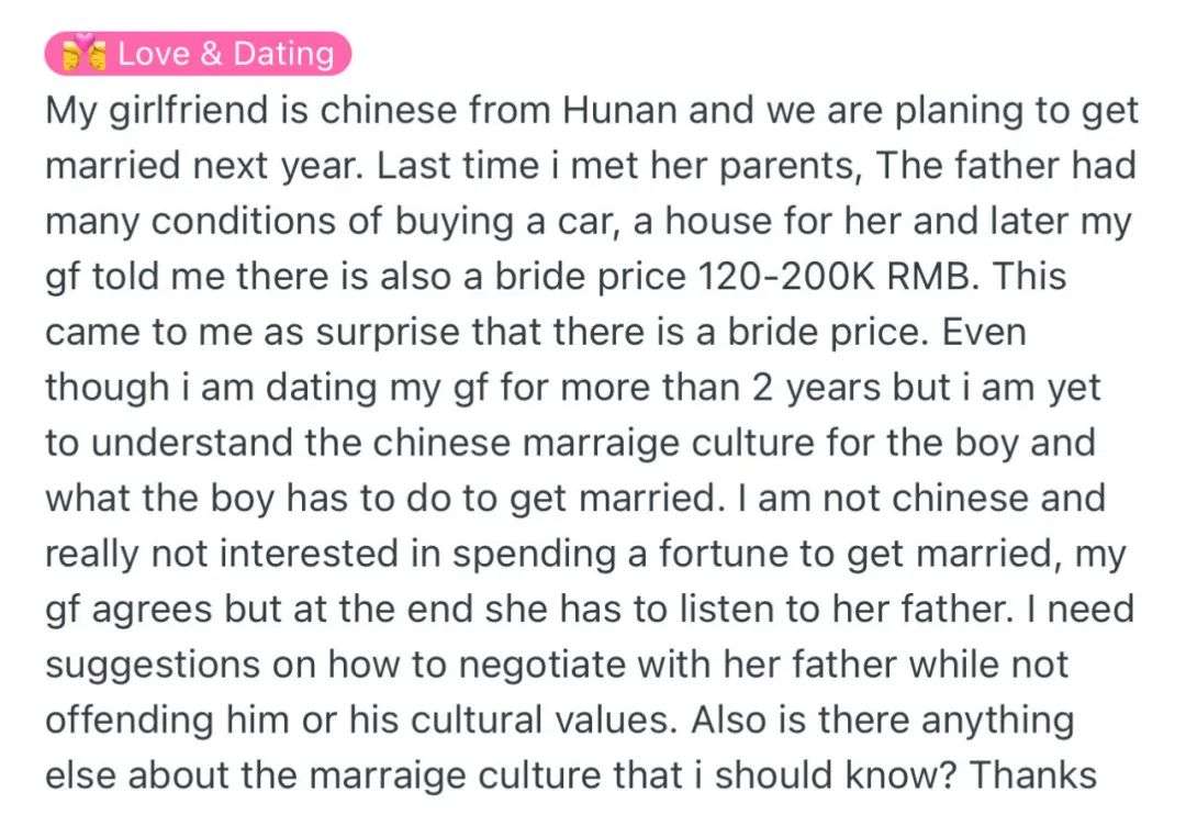 最后,他向网友求助,该怎么在不冒犯女友父亲和他的文化价值观的情况下,去和她父亲“谈判”。以及还有没有什么婚姻文化是需要自己知道的。