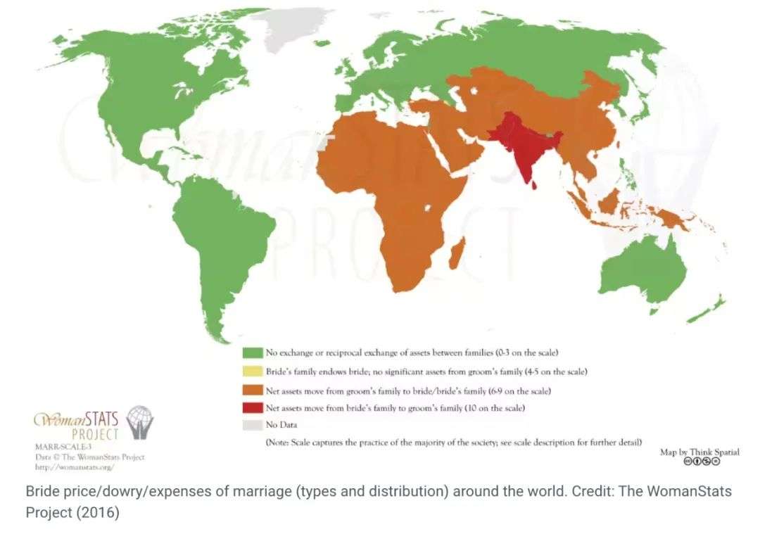嫁妆的传统在印度比较常见,而聘礼的传统则是在许多亚洲国家、非洲部分地区和一些太平洋岛屿都很常见。