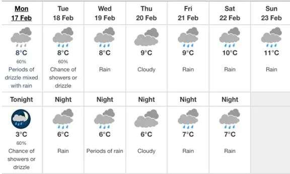 根据环境部的最新预测,温哥华本周大部分时间都会下雨,今明两天最高气温8℃,周四将达到9℃,周末会回到2位数。