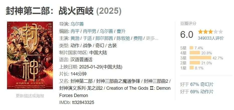 相比起第一部的好评如潮,《封神2》则遭遇了口碑滑铁卢,目前豆瓣评分仅为6分,较第一部的7.7分相去甚远。
