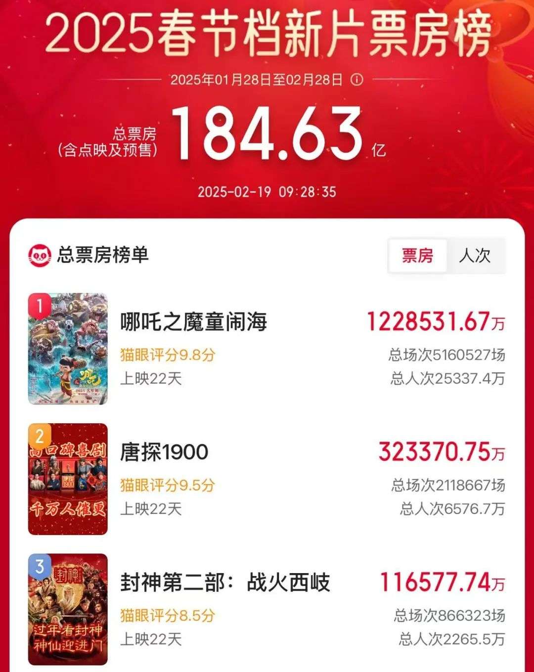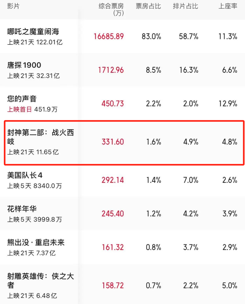 尽管已经密钥延期,但《封神2》的票房潜力几乎耗尽。遥想大年初一刚上映时,《封神2》排片占比高达21%,与《唐探1900》和《哪吒之魔童闹海》相差无几,当天便拿下3.83亿元票房。