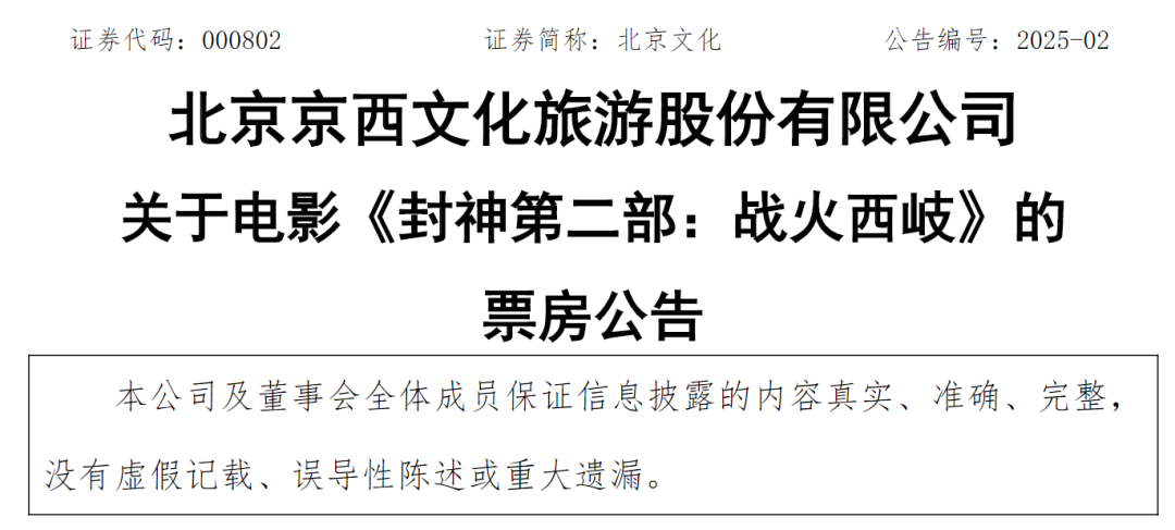 北京文化称,公司出品、制作、发行的电影《封神第二部:战火西岐》(以下简称“影片”)已于2025年1月29日09时起在中国大陆地区公映。根据中国电影数据信息网数据,截至2025年2月4日24时,影片在中国大陆地区上映7日,累计票房收入(含服务费)约为人民币10.13亿元,超过公司最近一个会计年度经审计的合并财务报表营业收入的50%。