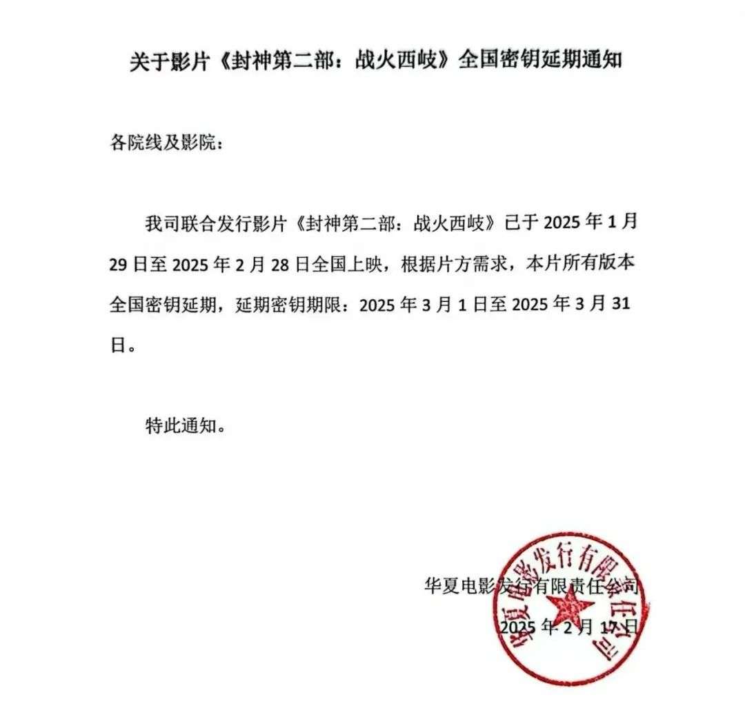 据猫眼专业版,华夏电影发行有限公司发布通知称,《封神第二部:战火西岐》已于2025年1月29日至2025年2月28日全国上映,根据片方需求,本片所有版本全国密钥延期,延期密钥期限:2025年3月1日至2025年3月31日。
