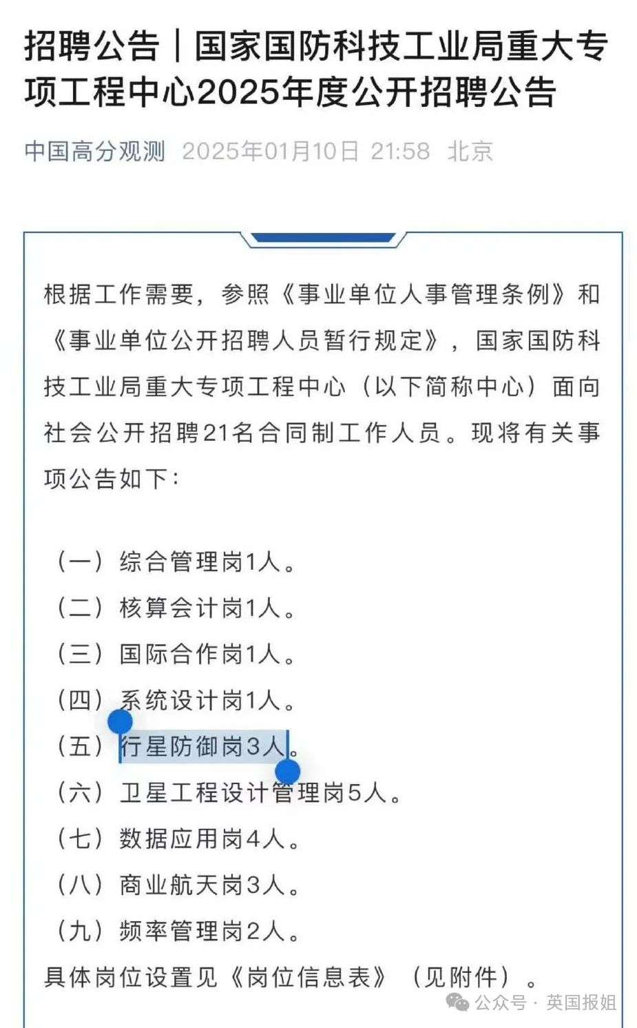 最近,网上热传中国国家国防科技工业局公开招聘“行星防御岗”员工的操作,让全网打工人DNA都动了……啥情况,咱不会真的要装行星发动机了吧?