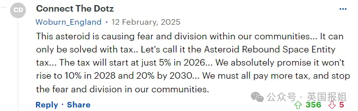 我们就叫它“小行星反弹空间实体税”吧…税率从2026年开始就5%…我们保证到2028年不会涨到10%,2030年也不会涨到20%…大家必须多交税,才能消除恐慌和分裂。”