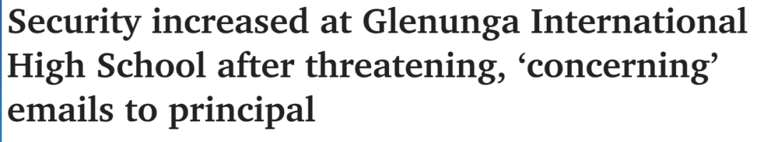 原文:https://www.adelaidenow.com.au/news/south-australia/security-increased-at-glenunga-international-high-school-after-threatening-concerning-emails-to-principal/news-story/7aa0f73133bcbfd3d0b9fa3a4d3048c1