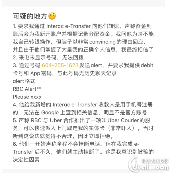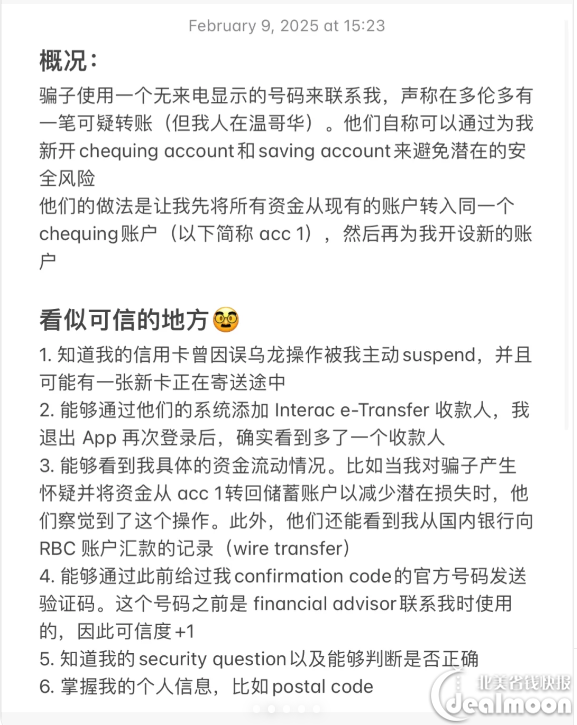 某天,这位网友接到一个无来电显示的电话,对方自称是RBC银行的安全部门,声称在多伦多发现了一笔可疑转账,但当时网友本人在温哥华。骗子一本正经地表示,出于安全考虑,需要为他新开一个支票账户(chequing account)和储蓄账户(saving account),来规避风险。