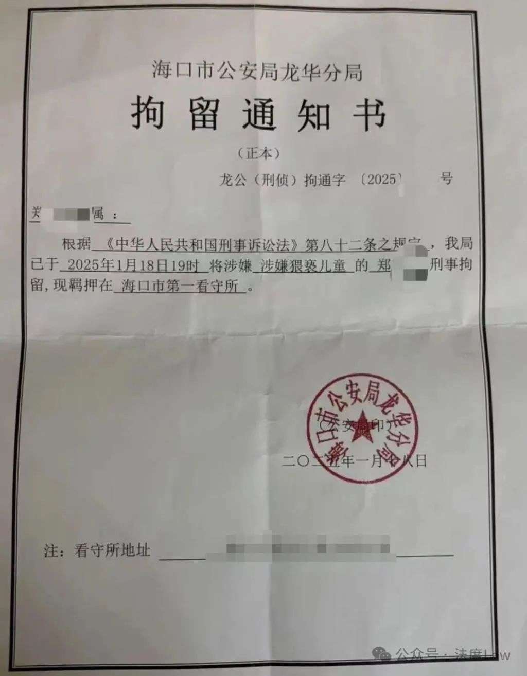 据澎湃新闻报道,其获得的《拘留通知书》显示,郑某某名为郑某峰,由海口市公安局龙华分局于今年1月18日签发,郑某峰因涉嫌猥亵儿童于当日19时被刑事拘留,其被羁押在海口市第一看守所。权威渠道人士告诉澎湃新闻,该《拘留通知书》是真实的。