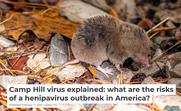 研究人员在美国阿拉巴马州的鼩鼱体内发现了 Camp Hill 病毒,这是一种亨尼帕病毒。这种病毒与致命的尼帕病毒有关(抽象来说就是姻亲关系),这引发了人们对人际传播和潜在流行病的担忧。