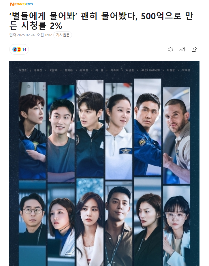 昨日,韩国最初航天题材拥有明星导演编剧和豪华演员阵容的500亿大制作——tvN土日剧《问问星星吧》以2.55%的低收视率凄惨收场,记者直接嘲讽“《问问星星吧》白问了,用500亿韩元创造的2%收视率”。