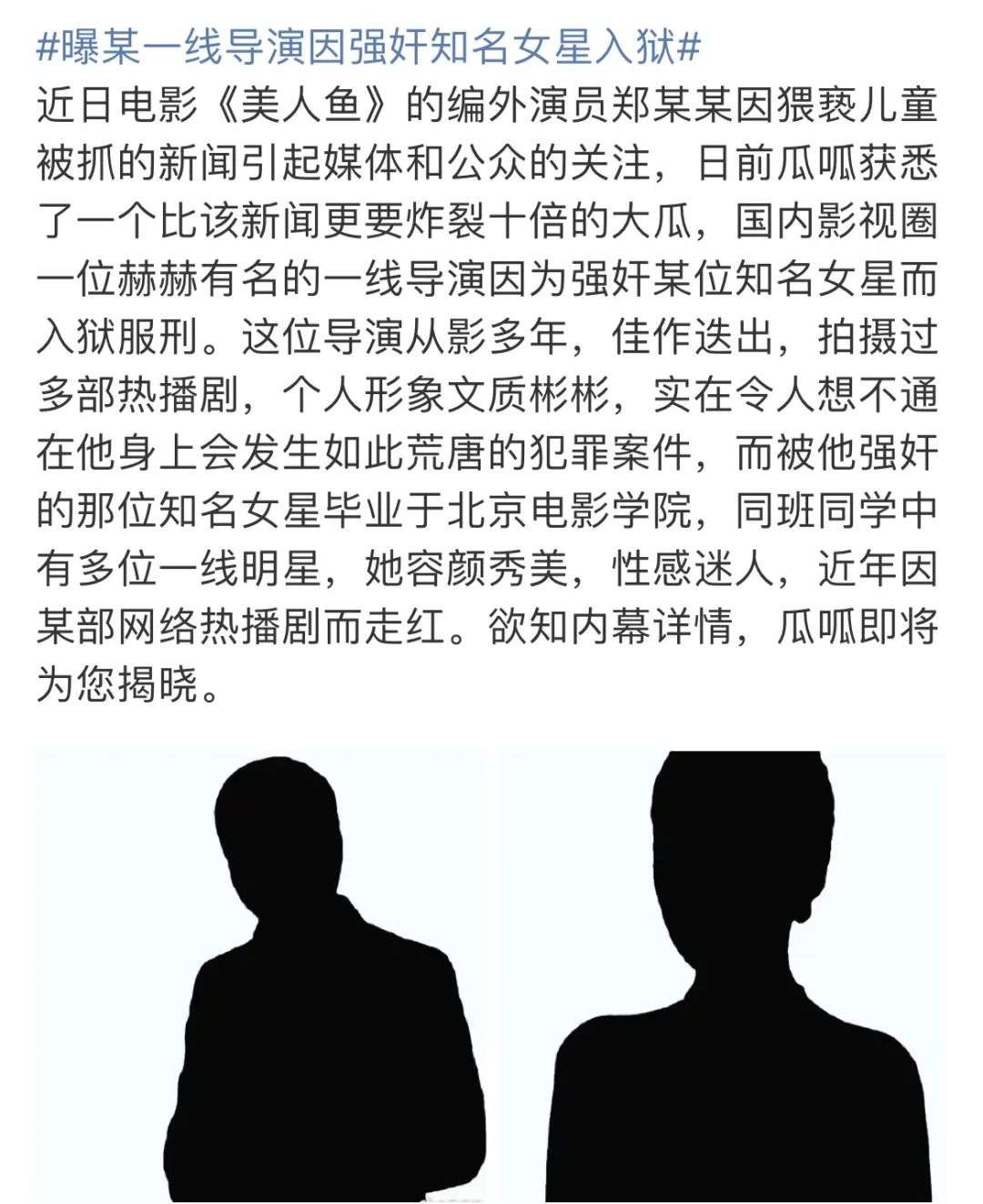 收藏某一线导演因强奸入狱,被强女星是北影毕业!