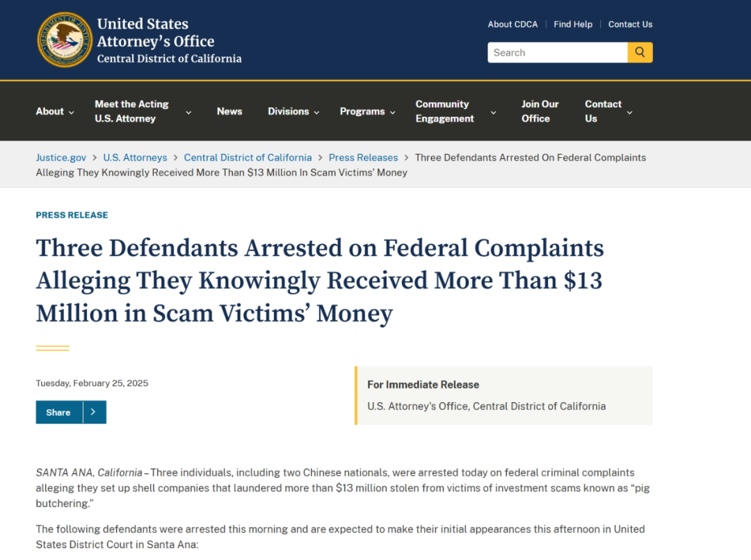 洛杉矶华人资讯网2月26日报道 周二,包括两名中国公民在内的三人因涉嫌利用空壳公司洗钱超过1,300万美元而被捕,这些资金来源于“杀猪盘”。