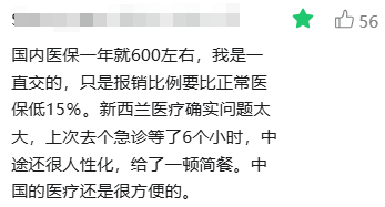 “新西兰医疗确实问题太大,上次去急诊等了6个小时。中国的医疗还是很方便的。”