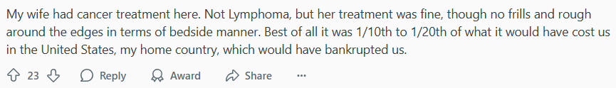 “我妻子在中国接受了癌症治疗。不是淋巴瘤,但她的治疗效果不错,我们去的医院并不花哨,在临床态度方面也有些粗糙,但费用只是美国的十分之一到二十分之一,否则我们会破产。”