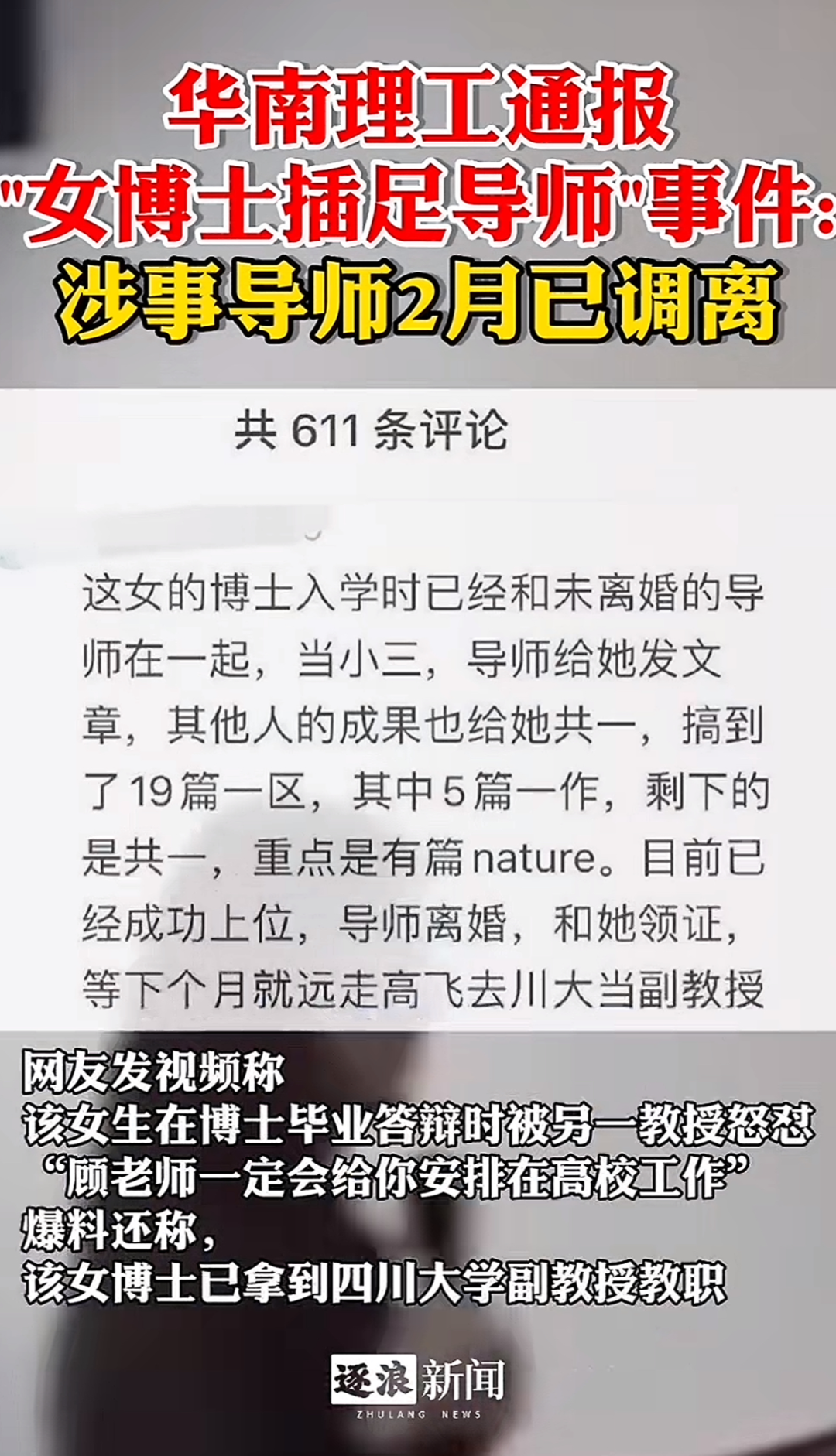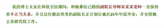 而有知情人士透露,该女博士入学期间就跟已婚导师在一起,成为他的婚外情人。