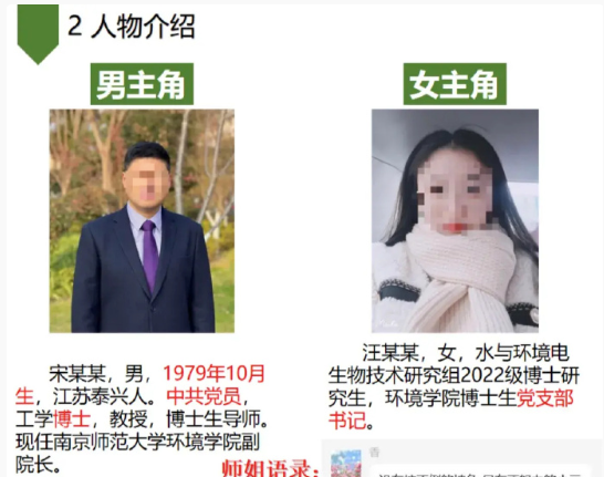事件的主人公,男人是南京师范大学环境学院副院长宋某某,而女生,是南京师范大学环境学院博士生汪某某。
