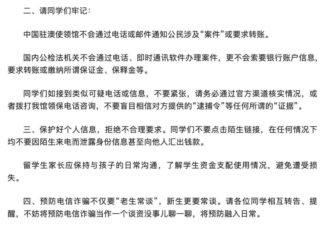 希望留学生们能牢记中国驻澳使领馆不会通过电话或邮件通知公民涉及“案件”或要求转账。