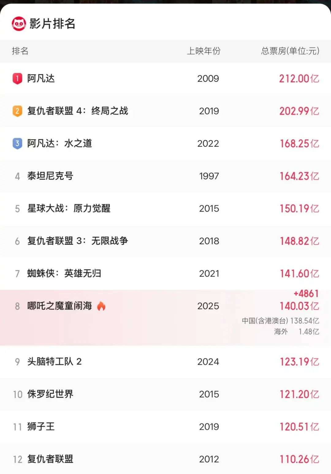 截至今天发文前,已经全球创下了140.03亿(人民币)的票房,打破了一系列纪录,现已跻身全球影视票房榜第8名!
