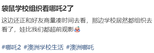 甚至有澳洲的华人妈妈发帖称,原本打算带孩子去看《哪吒2》,没想到孩子的学校竟然已经组织学生集体观影,还是澳洲本地的公立中学!