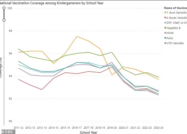 CDC的最新数据还显示,2024年全美幼儿园儿童的疫苗接种覆盖率下降至93%,而群体免疫的理想接种率需达到94%。