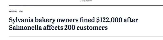 在悉尼就曾有过这样一个案例,在悉尼售卖面包的店主因为面包原料里含有沙门氏菌,而感染了近200名顾客,被罚了12万的巨款!