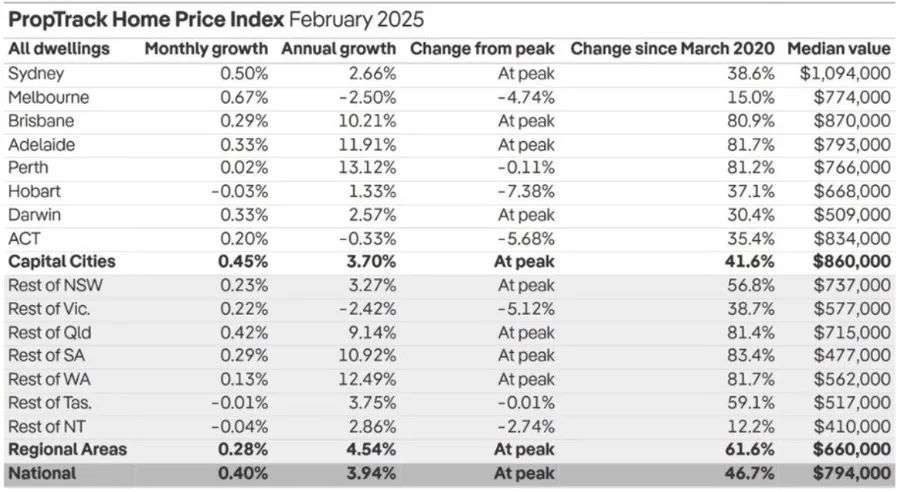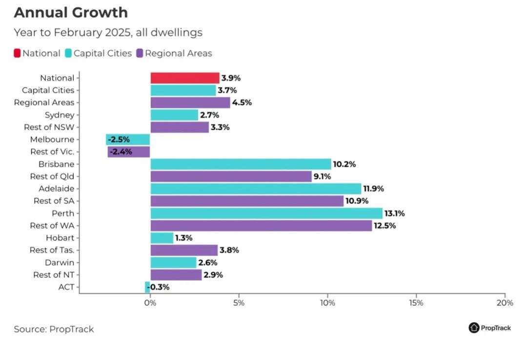 尽管近期涨势有所放缓,珀斯、阿德莱德和布里斯班依然是过去一年里房价表现最强劲的城市,分别上涨13.12%、11.91%和10.21%。