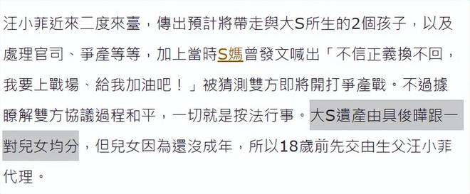 3月2日,台媒消息称,大S的遗产和儿女监护权等相关问题已处理完毕,遗产按法律规定为配偶具俊晔以及大S儿女所有,但由于孩子未成年,因此到18岁之前,遗产都由生父汪小菲代理。