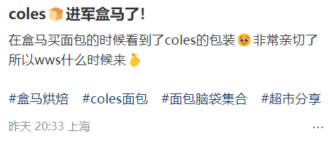 最近,有网友发现,在盒马超市的面包区,竟然看到了熟悉的Coles包装!