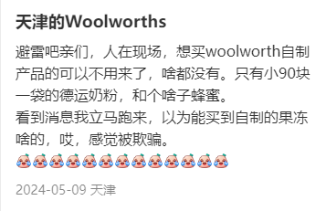 看一看这位网友的评价:赶紧避雷吧,亲测没有什么Woolworths的自制产品,只有90元一袋的德运,还有一些蜂蜜。