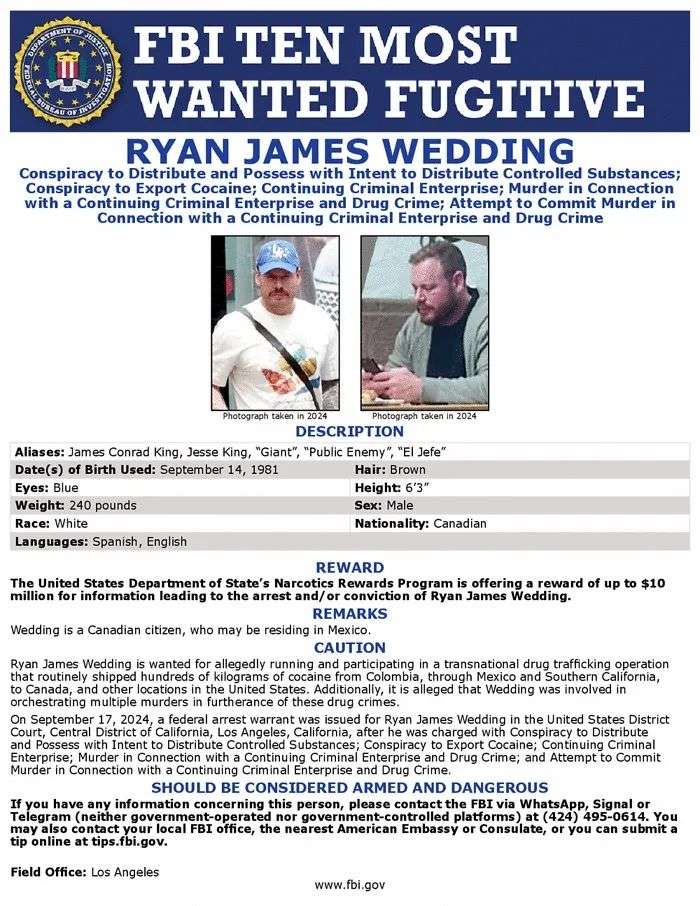 加拿大对美国毒品渗透有多严重?3月6日,联邦调查局(FBI)召开新闻发布会,正式将加拿大前奥运会滑板运动员、43 岁的瑞恩·韦丁 (Ryan Wedding) 列入美国联邦调查局十大通缉犯名单。