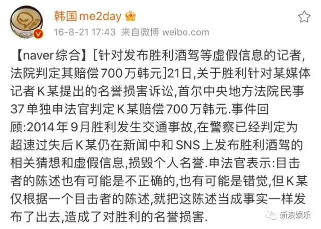 再比如之前李胜利酒驾事件——他因为当年爆料李胜利实际上是喝酒之后开车超速,但花钱摆平了酒驾,在2016年被法院判定赔偿700万韩元。
