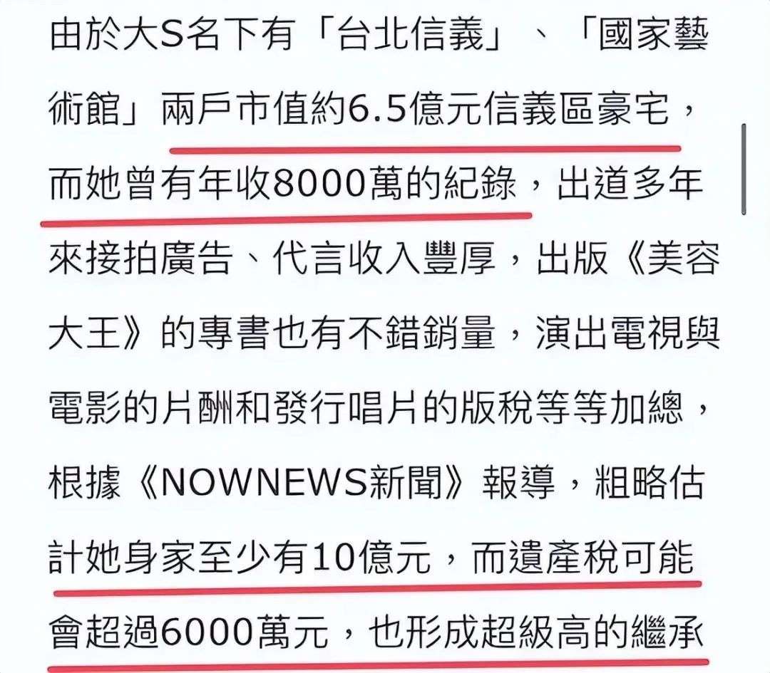 据报道,大S名下拥有两处豪宅,分别是“台北信义”和“国家艺术馆”,总价值约6.5亿台币。此外,大S从出道以来的广告、代言、影视剧收入等累计身家高达10亿台币。