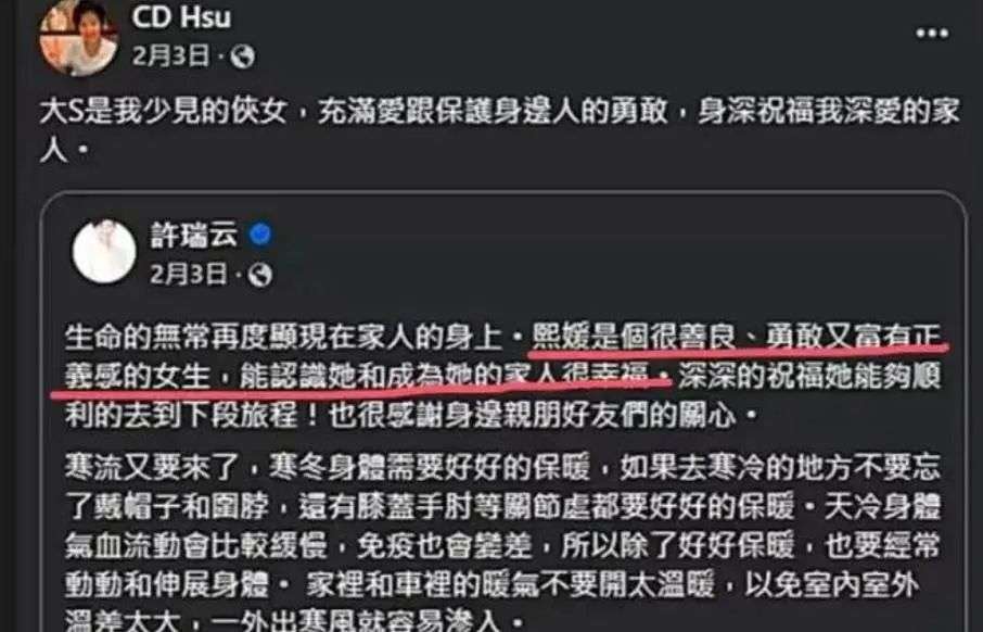 此外,许馨云还曾公开发文怀念大S,并描述了她生前真实的状态。她称大S是一位充满爱与勇气的“侠女”,字里行间透露出大S与许家人的深厚感情。
