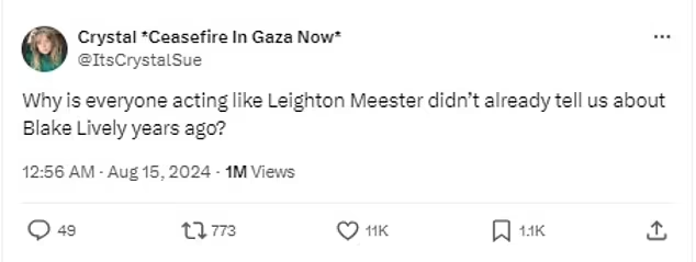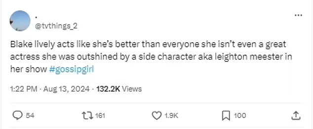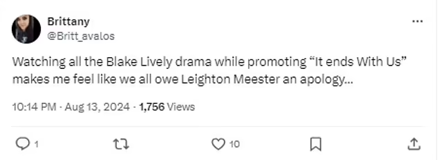 “看到布蕾克·莱弗利的口碑崩盘真是太爽了,最棒的结局就是我的女孩莉顿·梅斯特能迎来她应得的翻红。”