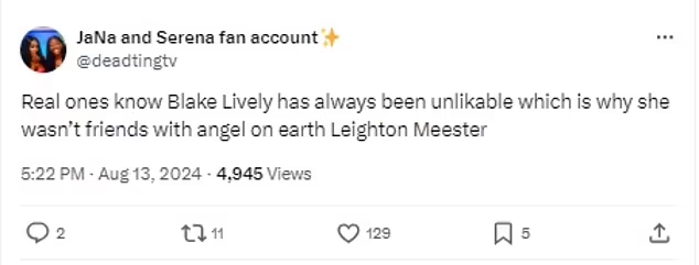 “真正懂行的人都知道布蕾克·莱弗利一直不太招人喜欢,这也是为啥她跟天使一样的莉顿·梅斯特不是朋友。”