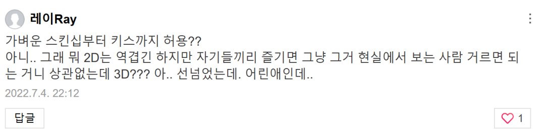 “从轻微的肢体接触到接吻都被允许??不是吧……算了,2D虽然让人恶心,但如果他们自己沉浸其中,只要现实中不影响别人就无所谓。