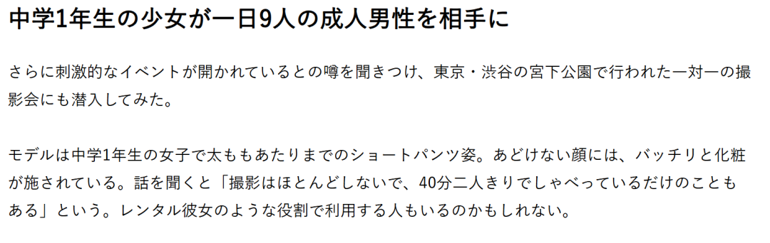 通常这些举办方会大肆招募年龄小的中小学生模特,再将这些模特作为商品贩卖出去,以一分钟摄影XX日元的价格去吸引一些摄影师。招募到一定数量的低龄模特后,举办方会定期举办一些活动。