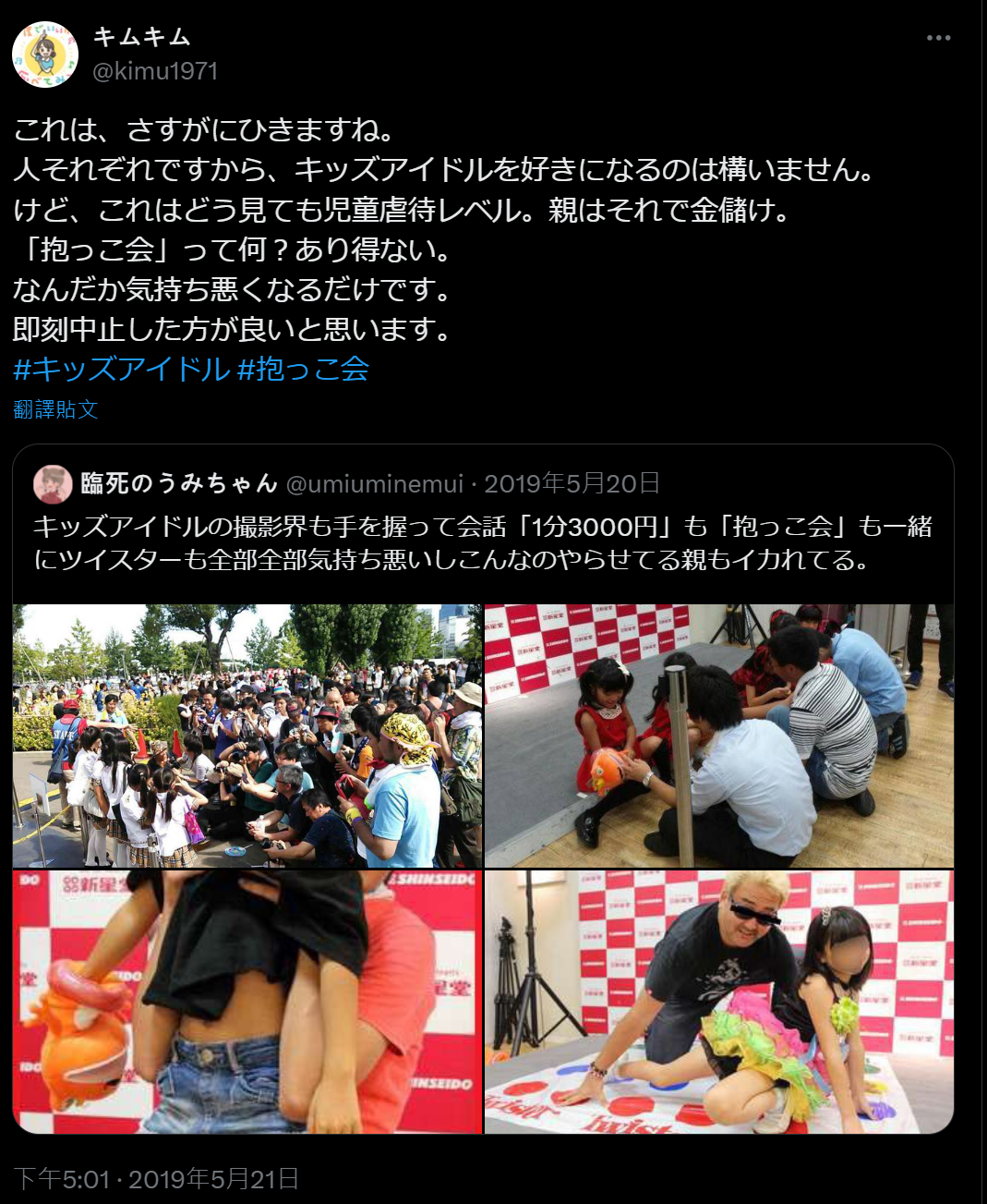 但这怎么看都是儿童虐待的程度,父母只是借此赚钱。抱抱会?这简直不可理喻。只会让人感到恶心。应该立即停止这种行为。”