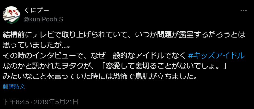 “很早以前,电视上就报道过这件事,我当时就觉得迟早会暴露出问题……在那次采访中,有人问那些宅男,为什么喜欢儿童偶像而不是普通偶像,其中一个人的回答大致是:'因为和她们恋爱不会背叛我们'。听到这句话的瞬间,我只觉得毛骨悚然,鸡皮疙瘩都起来了。”