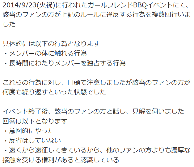 此组合举办的BBQ见面会活动上,一名粉丝故意多次触摸其中一名成员身体,并长时间独占某个成员的时间。被活动方禁止再次参与该组合活动后,此粉丝没有表现出任何悔意。并狡辩自己是长途跋涉来参加这个活动,因此有权利比其他粉丝可以更深度接触爱豆(奇葩脑回路,为什么不反思一下是不是自己住得太远了...)