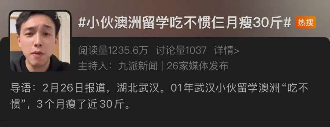 最近有一个#小伙澳洲留学吃不惯仨月瘦30斤#的词条冲上了微博热搜,瞬间就吸引了千万次的围观和大量的讨论。