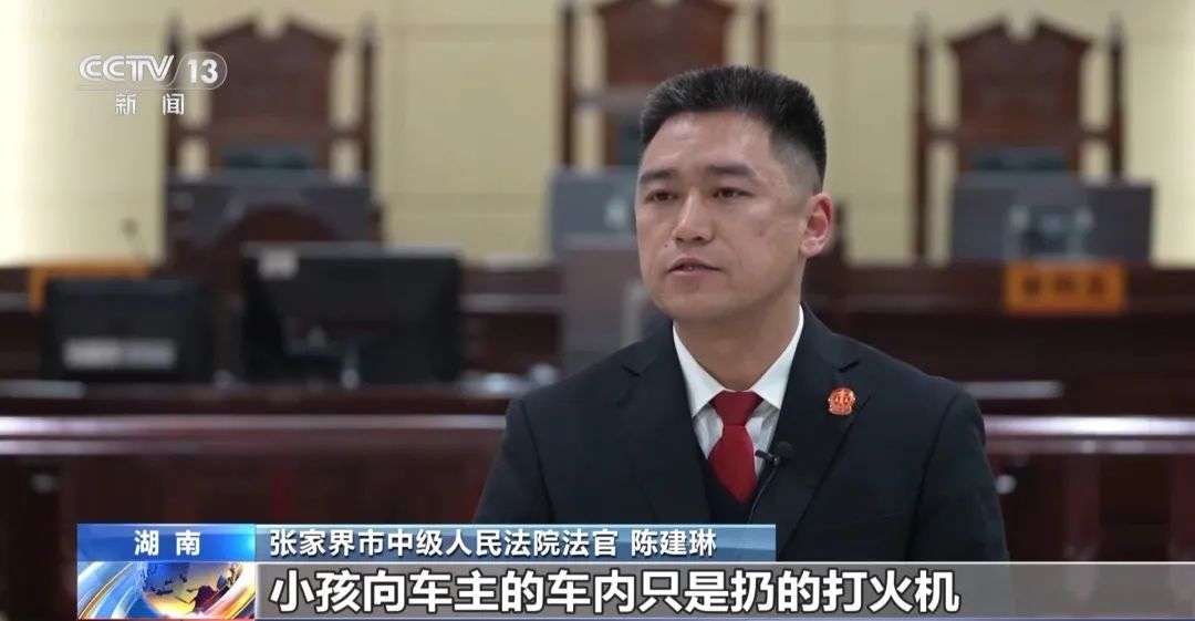 桑植县人民法院瑞塔铺人民法庭庭长梁婷:被告的小孩从车辆对面的马路边走往车辆途中,一直有点和丢的动作,在小孩走到起火车辆前部位置时,依然往车辆内丢放了一个鞭炮。