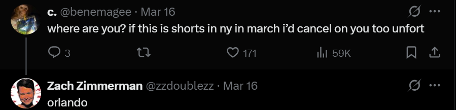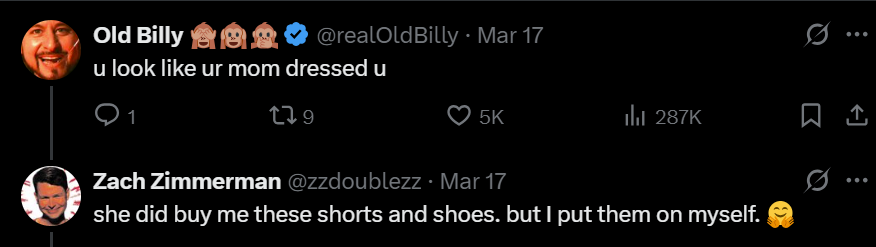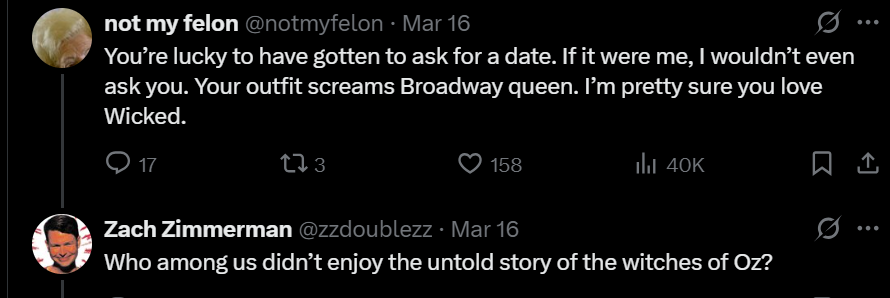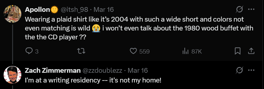 36 岁的布鲁克林喜剧演员兼作家扎克·齐默尔曼(Zach Zimmerman)在 X上晒出了两人的短信截图,还附上了自己当天穿搭的视频,迅速在网上走红,甚至激起了一场关于“穿搭合适与否”的大讨论。