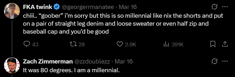 扎克则回复:“当时气温 80 华氏度(约 27℃)好吗?而且我是千禧一代。