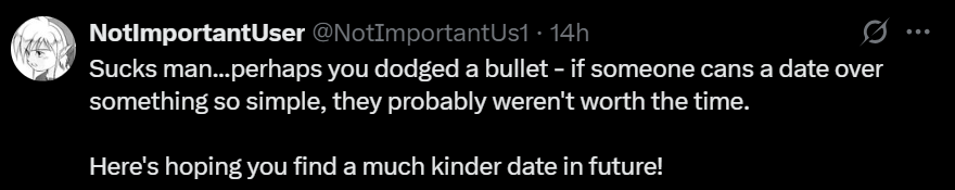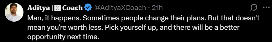 兄弟,这是常有的事。有时人们会临时改变计划。但这并不意味着你的价值就降低了。振作起来,下次会有更好的机会。