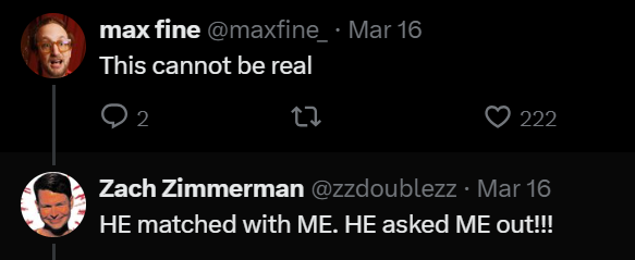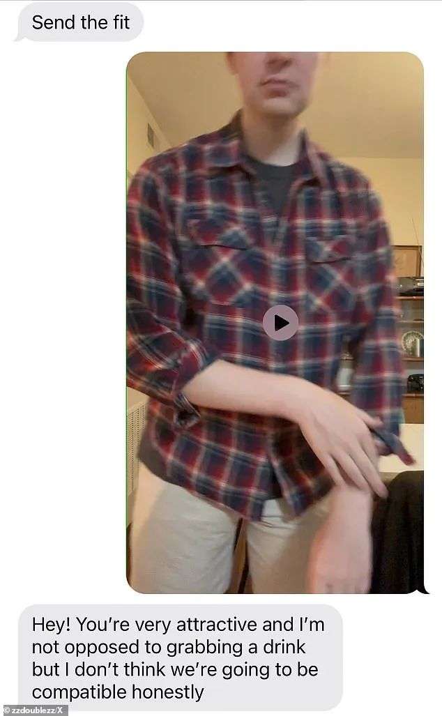 扎克在 X 上发帖写道:“他问我穿什么,然后看了视频后就取消了约会。我心碎了