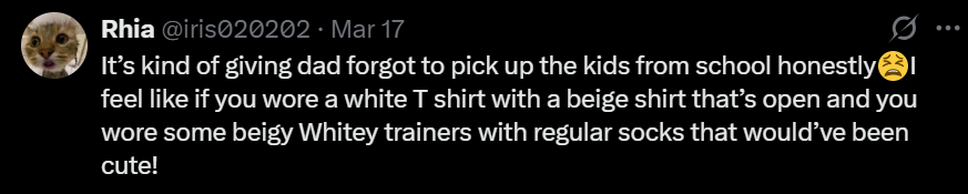 老实说,这有点像忘了去学校接孩子的爸爸😫,我觉得如果你穿一件白色 T 恤,配一件敞开的米色衬衫,再穿一双米色的运动鞋,配一双普通袜子,就会很可爱!