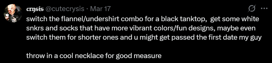 把法兰绒/打底衫组合换成黑色背心,买一些颜色更鲜艳/设计更有趣的白色衬衫和袜子,甚至可以把袜子换成短一点的,这样你第一次约会至少不会被鸽